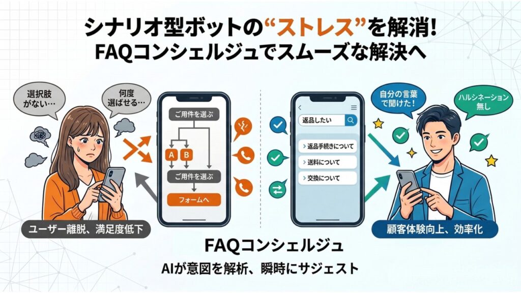 FAQコンシェルジュが解決する課題を、シナリオ型と比較しながら整理すると以下のとおりです。